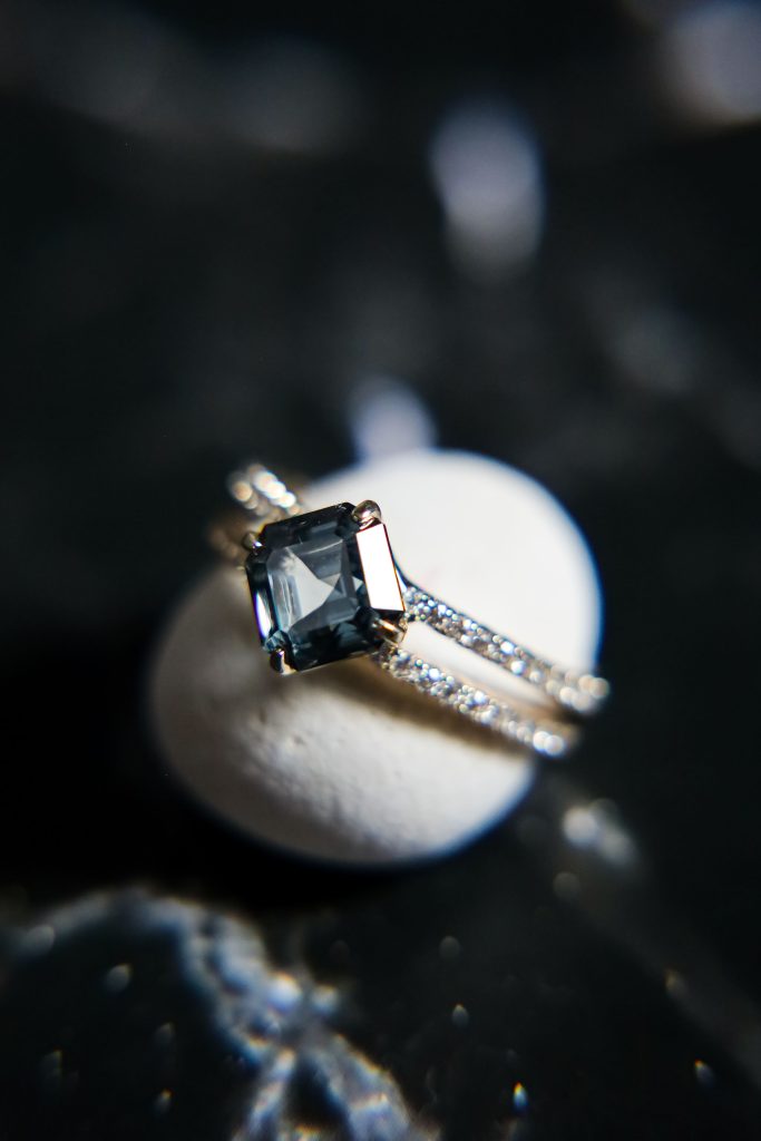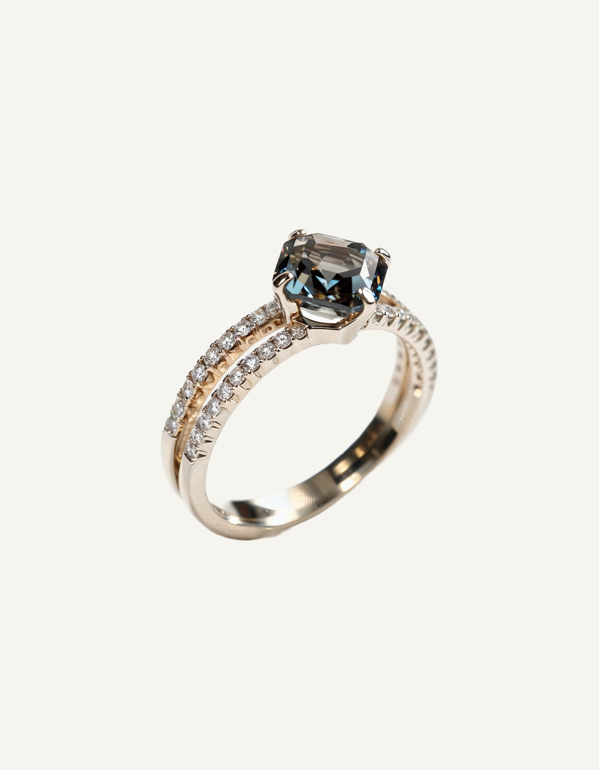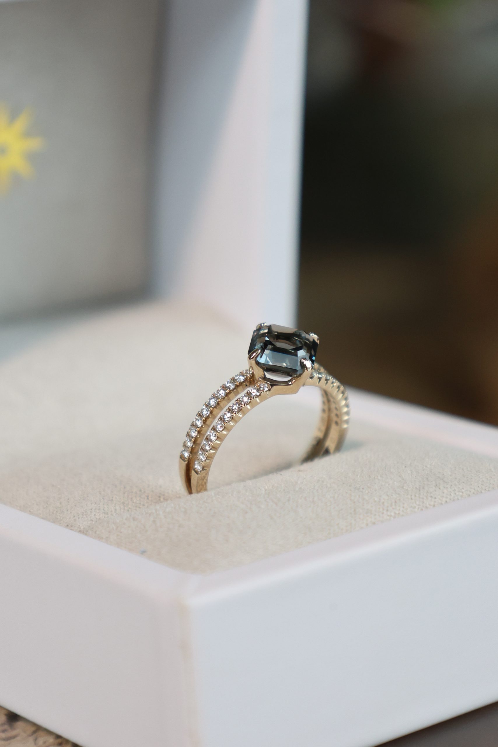 Grafitowy spinel z Birmy (2,13 ct) w szlifie asscher, ustawiony diagonalnie, pokazuje zupełnie nową twarz klasyki.