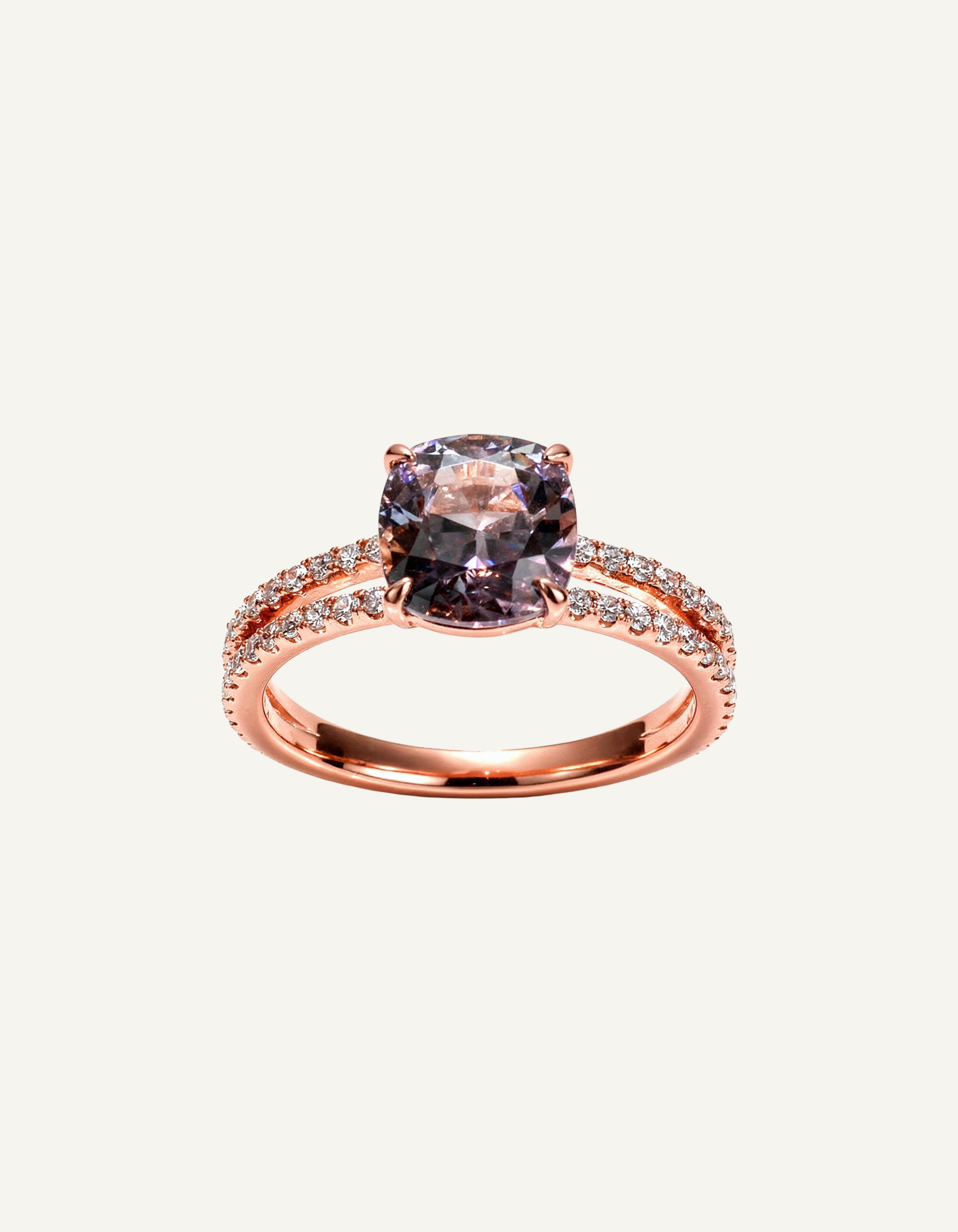Grafitowy spinel z Birmy (2,13 ct) w szlifie asscher, ustawiony diagonalnie, pokazuje zupełnie nową twarz klasyki.