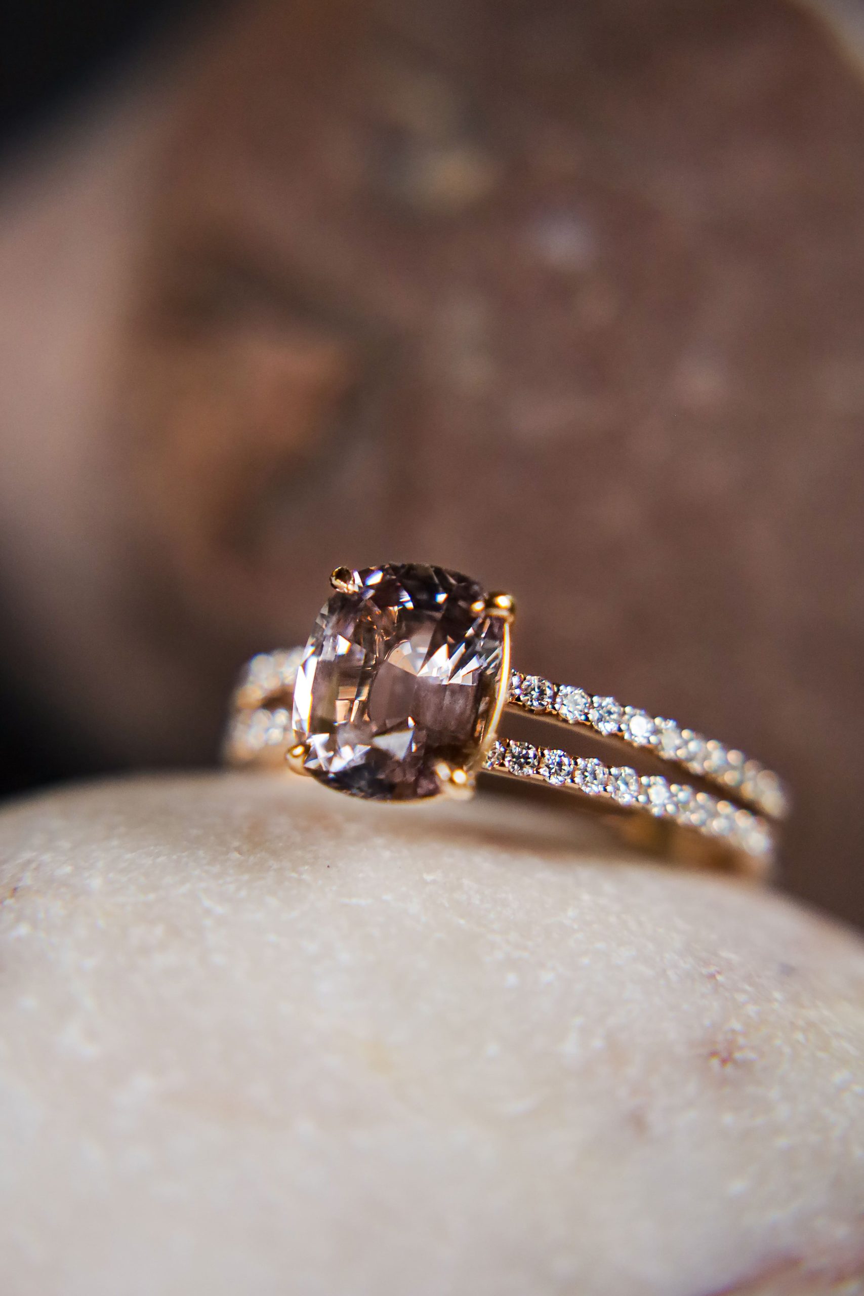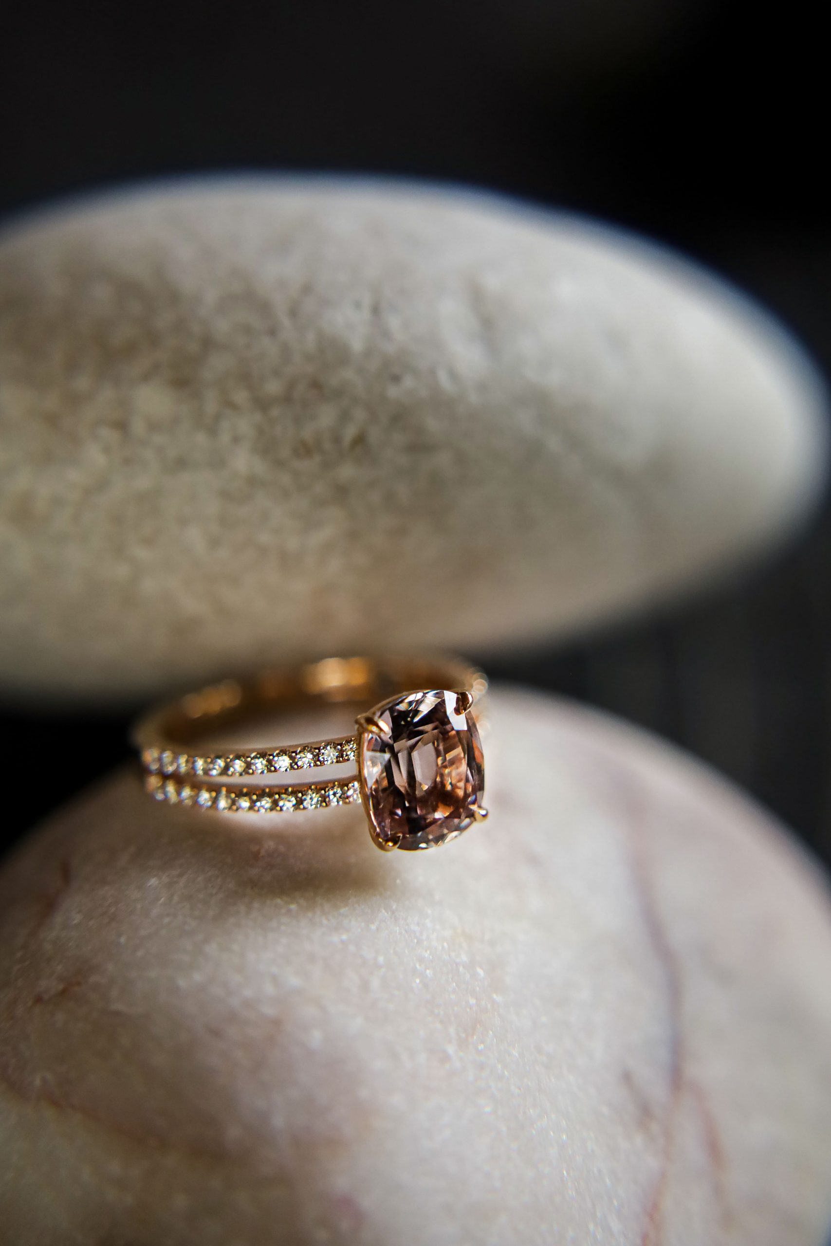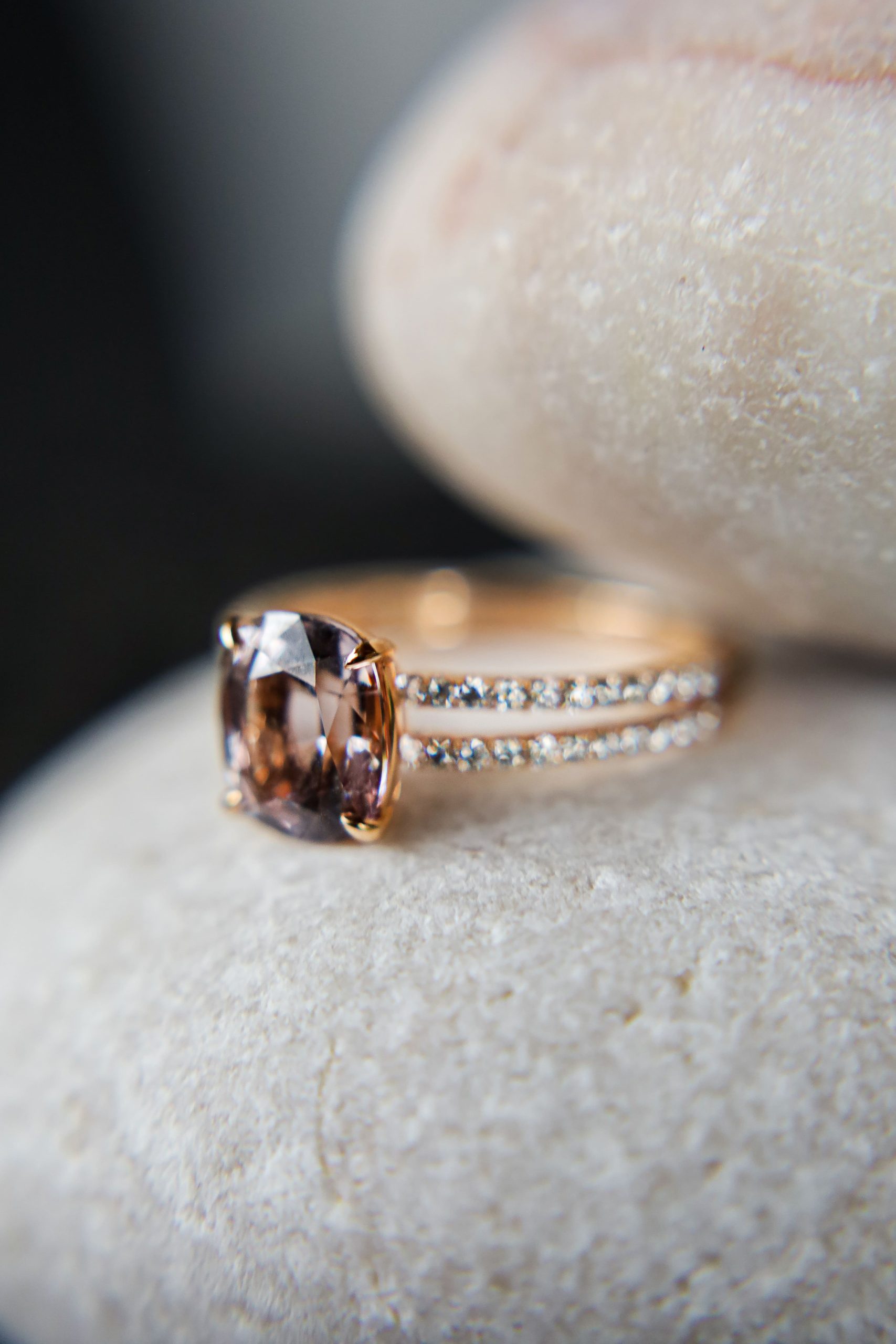 Oprawiony w delikatne łapki, wsparty przez podwójną obrączkę wysadzaną diamentami (0,27 ct), tworzy duet, który łączy architektoniczną precyzję z miękkim blaskiem złota 18K.