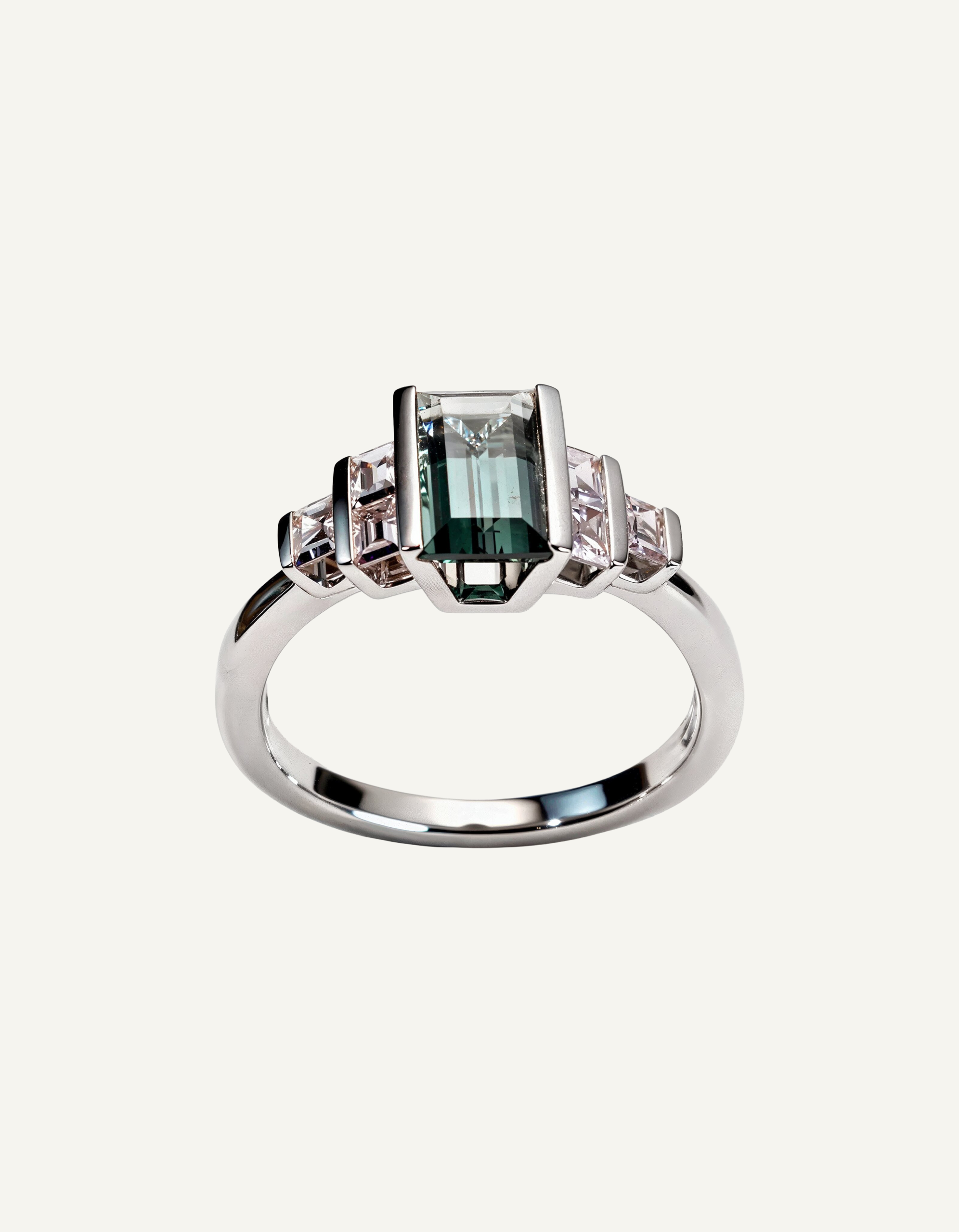 Nieoczywista, teatralna forma oprawy z 18-karatowego białego złota podkreśla geometrię kamieni i ich szlachetny ton.