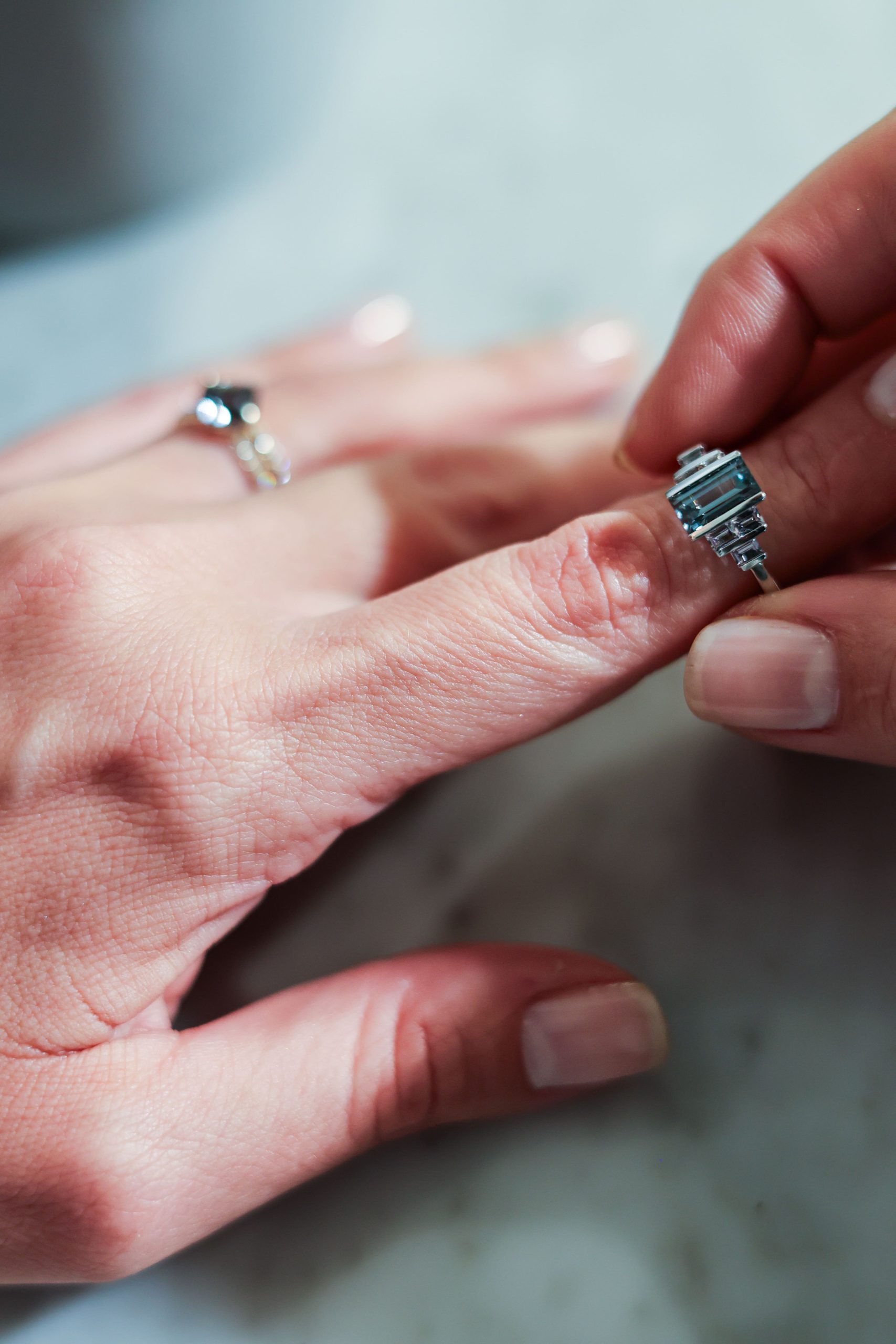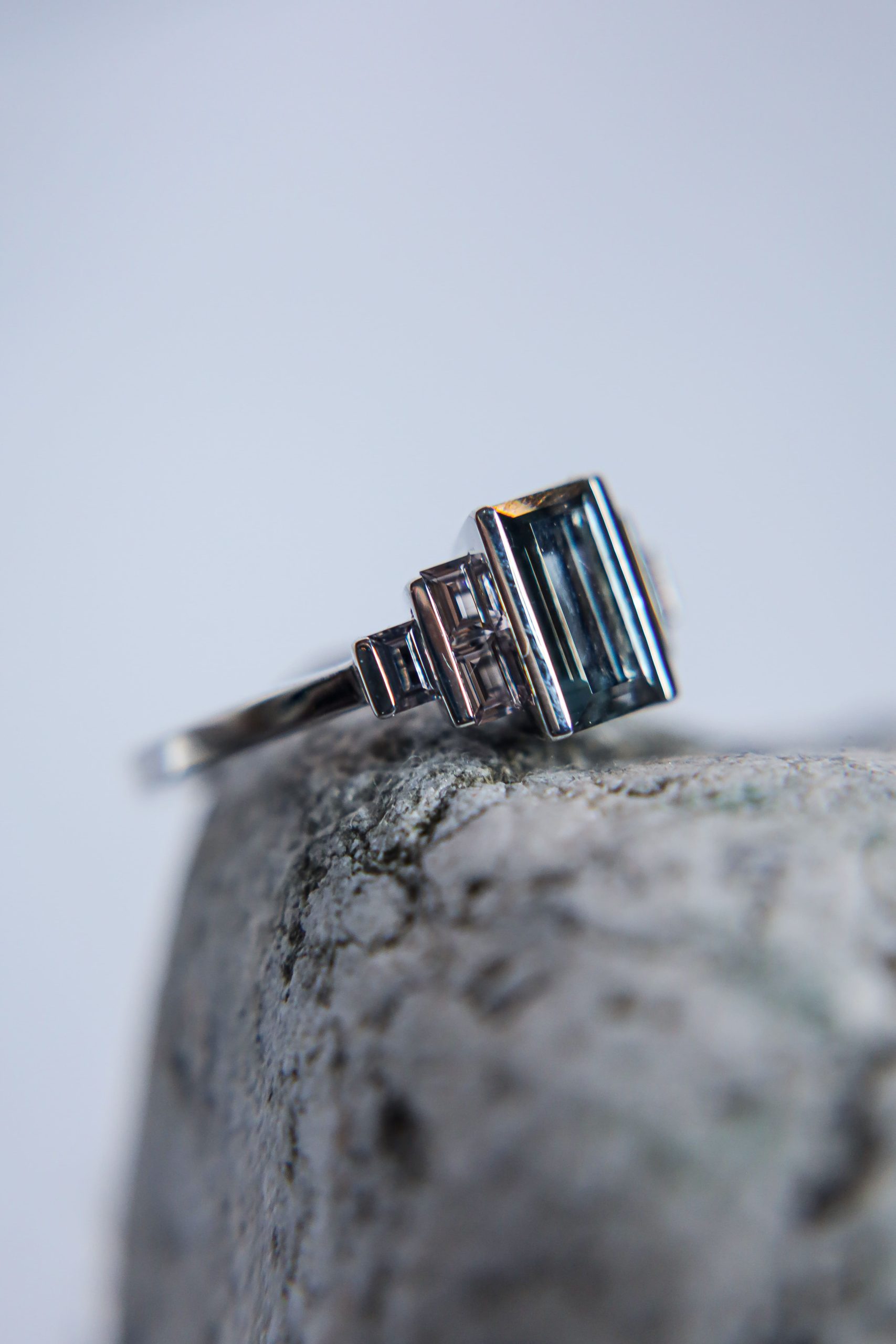 Towarzyszą mu sześć mniejszych spineli (0,44 ct), tworząc architektoniczną kompozycję o wyraźnie współczesnym charakterze.