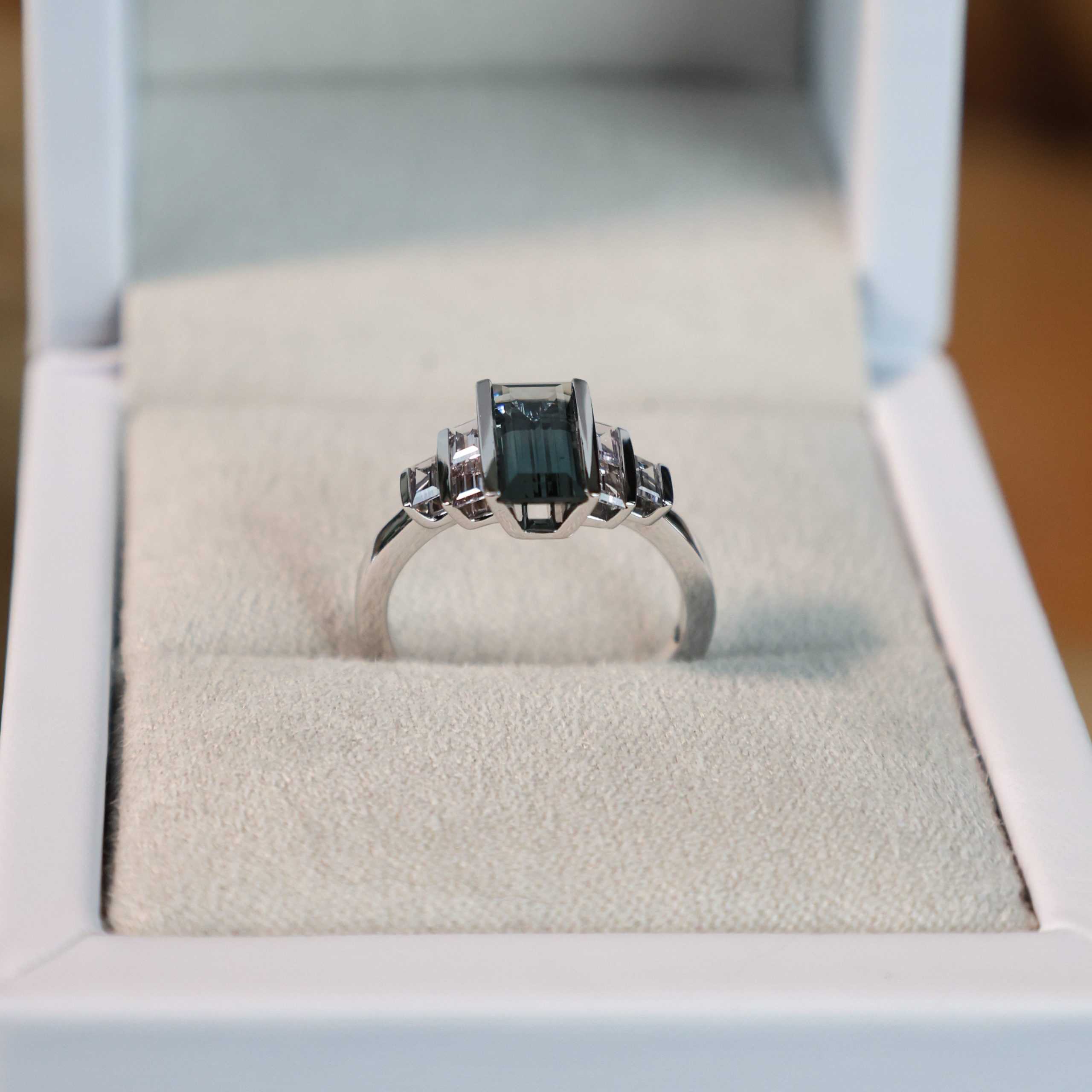 Srebrny spinel z Birmy (1,44 ct) w szlifie schodkowym — kamień, który łączy głębię grafitowego blasku z rzadko spotykaną przejrzystością.