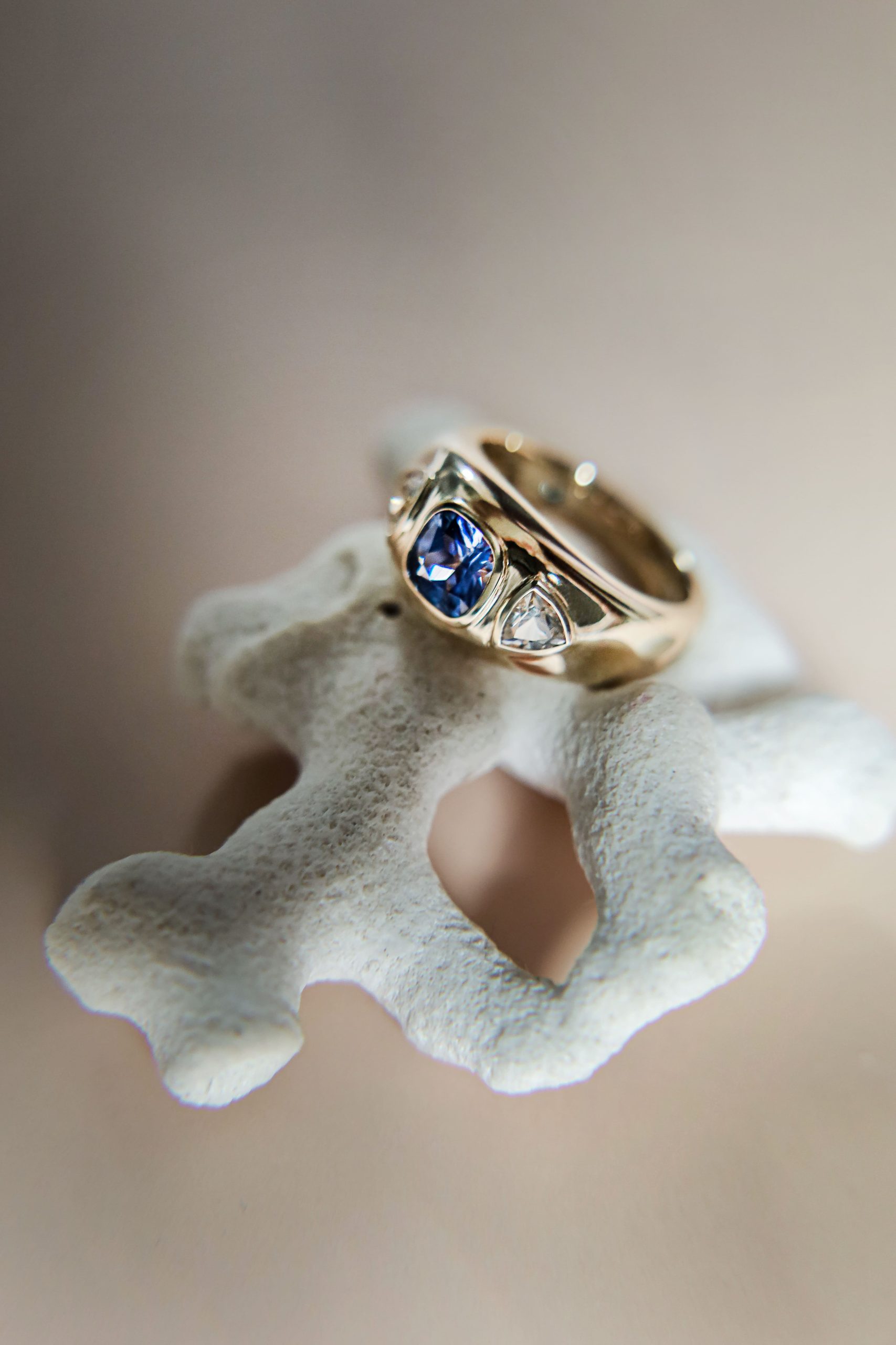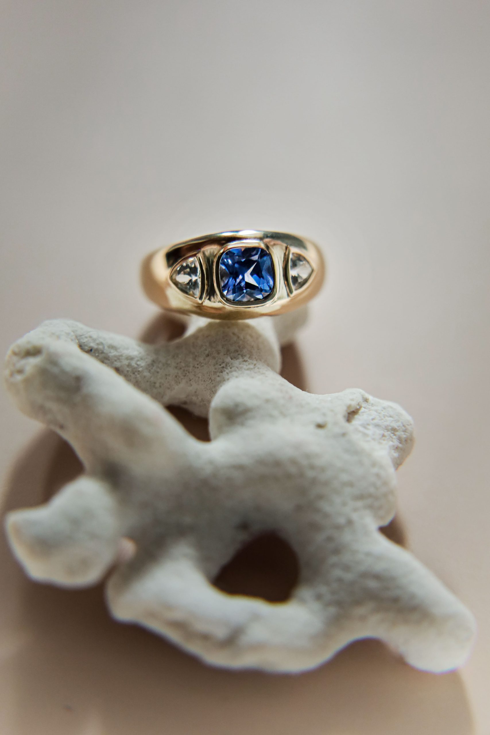 Centralny szafir ze Sri Lanki (1,2 ct) w szlifie radiant otoczony jest dwoma białymi szafirami z Madagaskaru (0,61 ct), oprawionymi w 18K złoto.