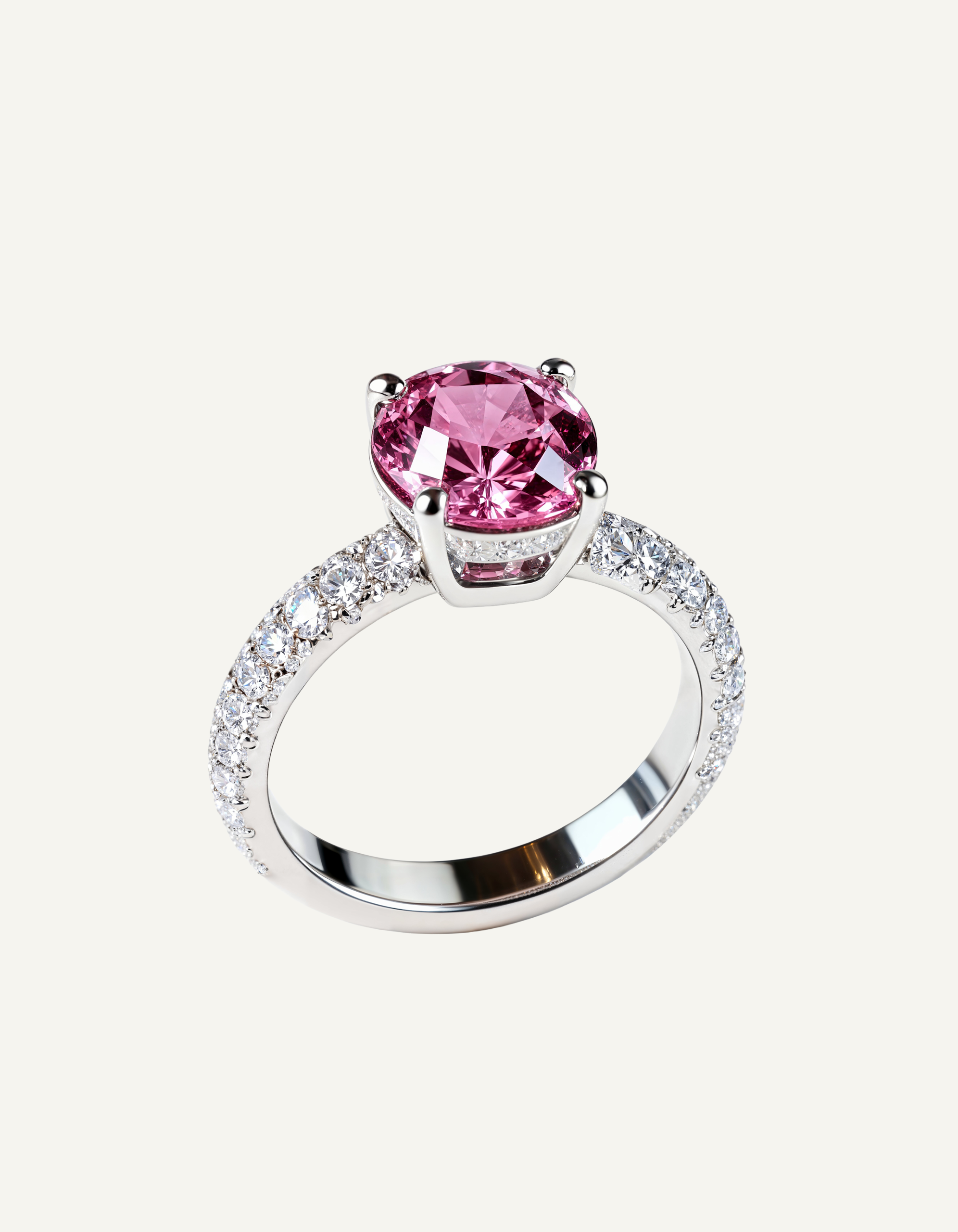 Ten niezwykły klejnot z Birmy, w rzadkim szlifie poduszkowym o masie 2,71 ct, zachwyca głębią różu, który pulsuje niczym żywa tkanka światła. Osadzony w misternych łapkach, spoczywa na obrączce wysadzanej 98 diamentami o łącznej masie 0,59 ct, tworząc kompozycję pełną blasku i kobiecej elegancji.